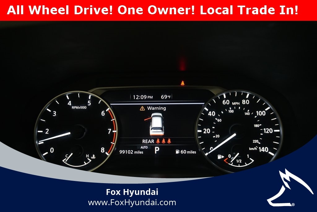 AWD, 19" Aluminum Alloy Wheels, 4-Wheel Disc Brakes, 5.604 Axle Ratio, 6 Speakers, ABS Brakes, Air Conditioning, Alloy wheels, AM/FM Radio, AM/FM Radio, Auto High-beam Headlights, Auto-dimming Rear-View mirror, Automatic temperature control, Black Splash Guards (Set of 4), Bose Premium Audio System, Brake Assist, Bumpers: body-color, Chrome Rear Bumper Protector, Delay-off headlights, Driver door bin, Driver vanity mirror, Dual front impact airbags, Dual front side impact airbags, Dual-Climate Control, Electronic Stability Control, Emergency communication system: NissanConnect Services, First Aid Kit, Floor Mats w/2-Piece Cargo Area Protector, Four wheel independent suspension, Front anti-roll bar, Front Bucket Seats, Front Center Armrest, Front Fog Lights, Front reading lights, Fully Automatic Headlights, Heated Front Bucket Seats, Heated Front Seats, Heated Sideview Mirrors, Heated Steering Wheel, Illuminated Entry, Knee airbag, Leather steering wheel, Leather-Appointed Seat Trim, Low Tire Pressure Warning, Memory seat, NissanConnect featuring Apple CarPlay and Android Auto, Occupant sensing airbag, Outside Temperature Display, Overhead airbag, Overhead console, Panic Alarm, Passenger door bin, Passenger vanity mirror, Power Adjusting Driver Seat, Power door mirrors, Power Liftgate, Power moonroof, Power passenger seat, Power steering, Power Windows, Radio data system, Rear air conditioning, Rear anti-roll bar, Rear Parking Sensors, Rear seat center armrest, Rear side impact airbag, Rear Spoiler, Rear Window Wiper, Rear-View Camera, Rear/Front Window Defroster, Remote Keyless Entry, Roof rack: rails only, Security System, Speed control, Speed-Sensitive Wipers, Split Folding Rear Seat, Steering Wheel Mounted Controls, Tachometer, Telescoping steering wheel, Tilt steering wheel, Traction Control, Trip computer, Turn Signal Indicator Mirrors, Variably intermittent wipers, AWD.
